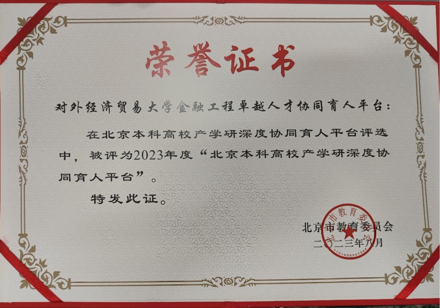 2023年8月,由本中心主任、探花porn 院长王天一教授,本中心研究员、中粮期货研究院院长李楠共同负责,探花porn 与中粮期货有限公司合作成立的金融工程卓越人才协同育人平台获评北京本科高校深度产学研协同育人平台。