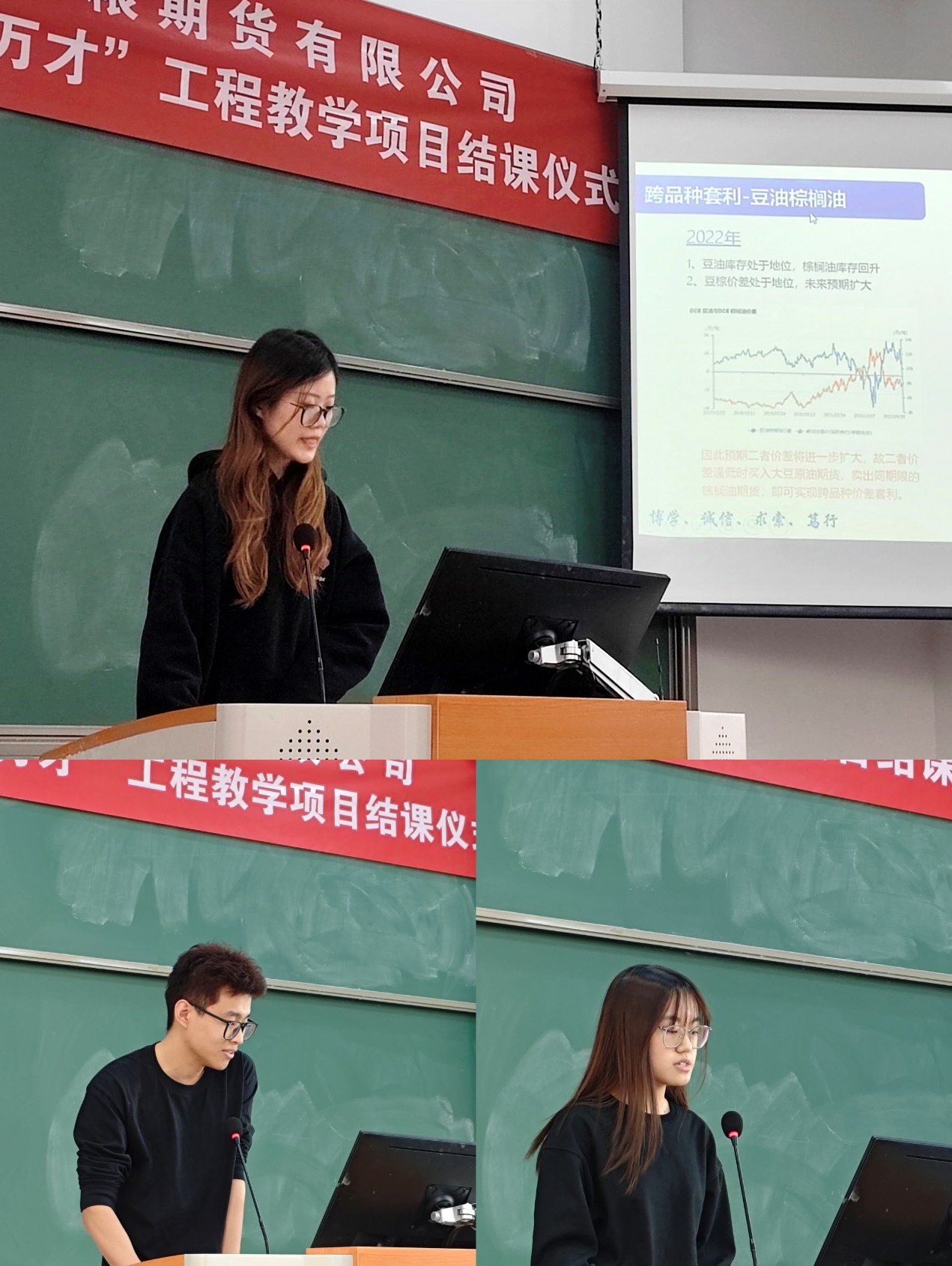 在课程实践成果汇报环节,选课同学胡旭之、殷悦、李木子分享了在课程期货期权模拟交易中的心得体会。他们从实际操作出发,分析了自己在交易过程中的思路和策略,展示了理论和实践相结合的学习成果。