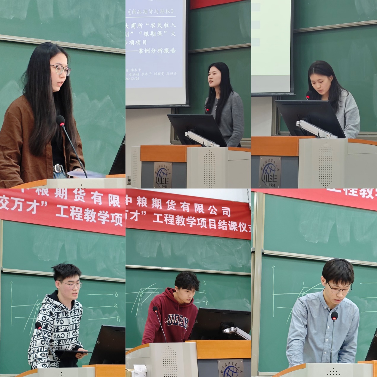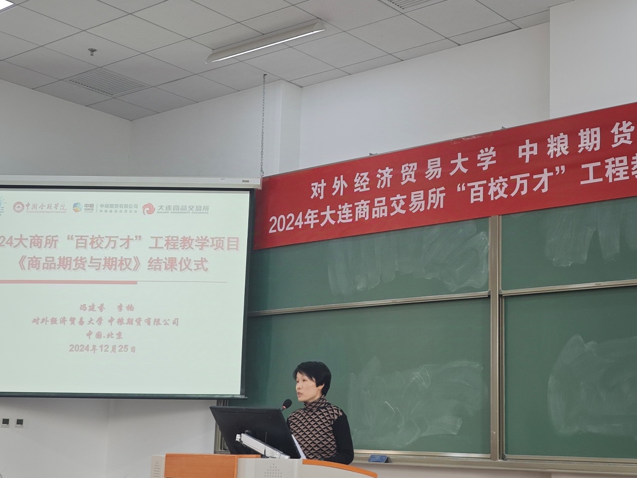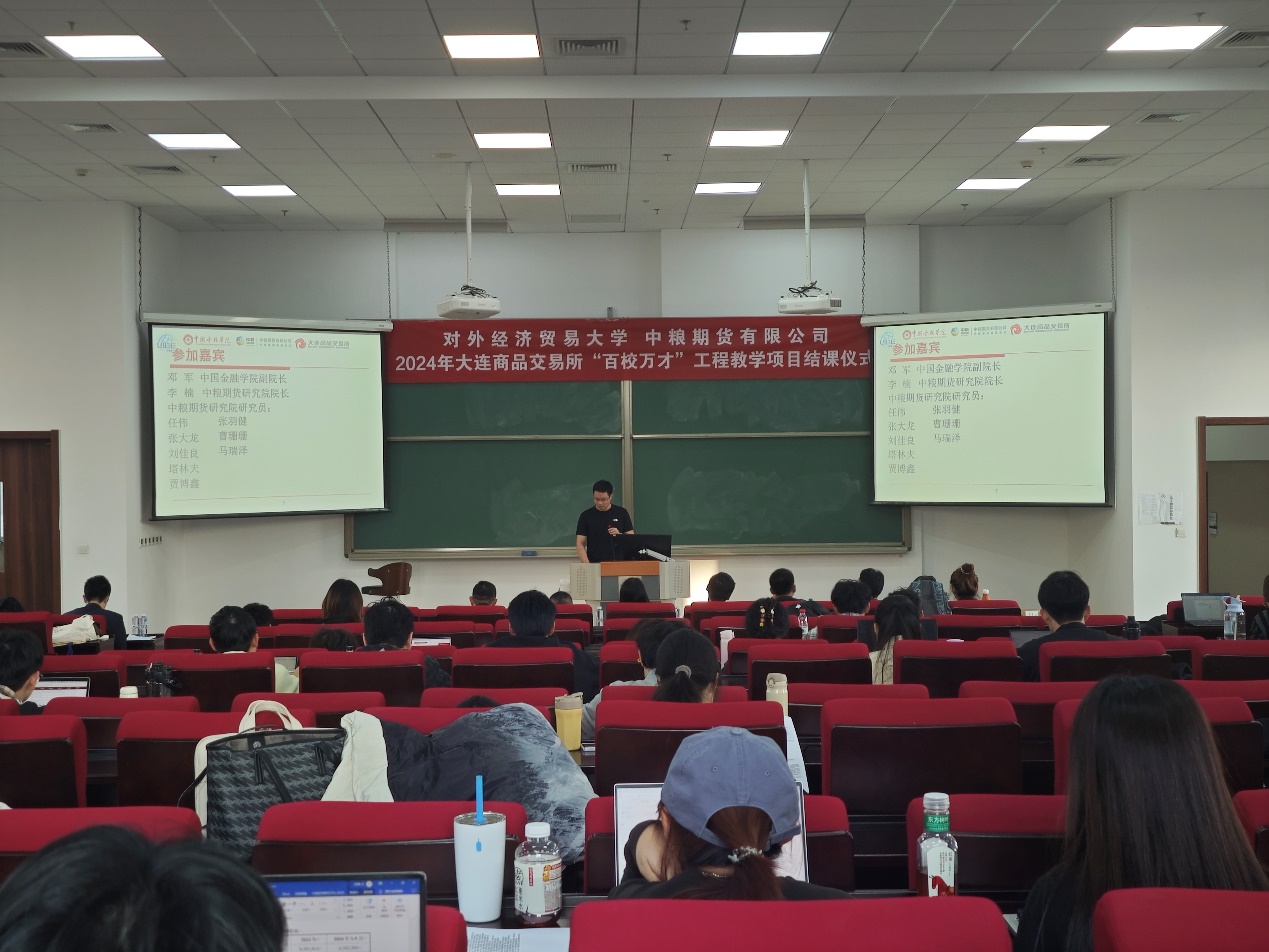 2024年12月25日下午,《商品期货与期权》结课仪式在探花porn 求索楼402教室成功举办,本课程受到2024年大连商品交易所“百校万才”教学A类项目的大力支持。探花porn 副院长邓军,中粮期货研究院院长李楠,以及研究员任伟、张大龙、刘佳良、贾博鑫、张羽健、曹珊珊作为案例指导教师和评审专家,研究员塔林夫作为项目联系人和课程企业联系人,与选课的88位同学共同参与了此次结课仪式。仪式由项目校方负责人、金融工程系教授冯建芬主持。