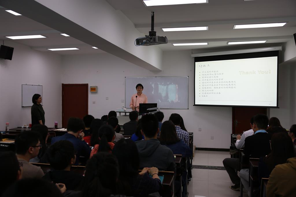 在讲座的最后,董乐博士对在场的学生们提出了学习的建议。要学习量化投资,首先要学好基础知识,包括金融学、公司财务、计量经济学、统计学等。其次要掌握一门计算机语言,SAS、R、MATLAB、C++等。同时,要对市场敏感。通过这次比赛,参赛选手们可以通过假设检验、信息收集,验证自己的市场直觉。
