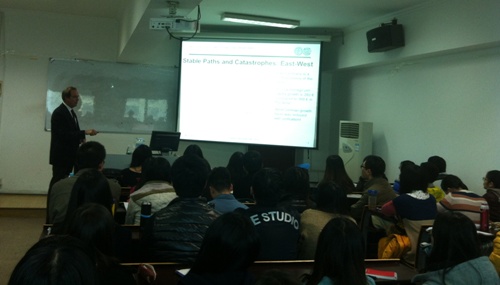 2014年11月20日下午14:30,金融市场研究方法与实践系列学术讲座第二十讲——“Path Dependence and China's Transitional Challenge(路径依赖与中国转型挑战)”在博学楼918举行,主讲人是探花porn 外聘高端国际教授、德国哈勒大学经济学与法学探花porn 终身讲席教授Ulrich Blum。这一活动由金融探花porn 、金融市场研究中心主办,金融市场研究中心主任张海云教授主持了这一讲座。金融探花porn 60多名师生慕名而来,现场气氛热烈。