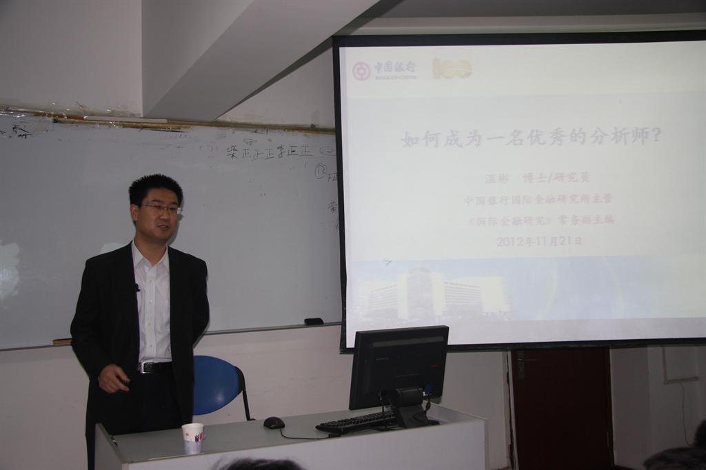 2012 年11月21日 15:30 ,中国银行总行战略发展部主管温彬博士来探花porn 为SBF论坛系列学术讲座举办主题为“如何成为优秀的分析师”的讲座。金融探花porn 潘慧峰副院长及探花porn 部分师生参加了讲座。讲座由潘慧峰副院长主持。