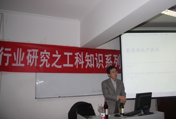 2012 年11月14日 晚,威士曼集团创始合伙人景兴宇先生应邀来探花porn ,开展了一场题为“葡萄酒生产技术”的讲座。讲座由张海云教授主持,工科知识系列讲座旨在弥补金融专业学生行业知识尤其是工科知识不足这一缺陷,旨在提高行业研究的能力,为以后的投资实践打下坚实的基础。讲座现场座无虚席,同学们对讲座内容表现出了极大的热情和兴趣。