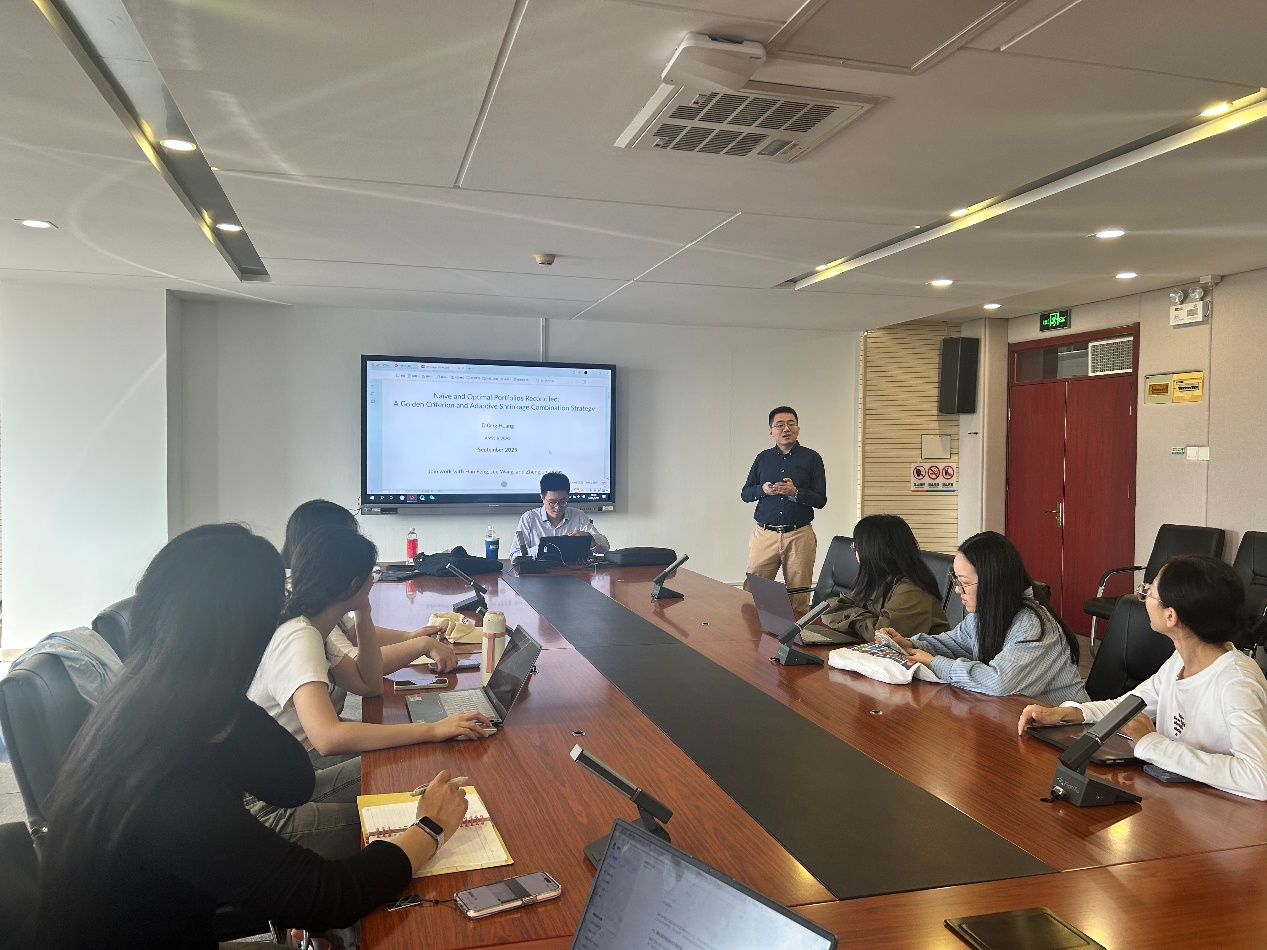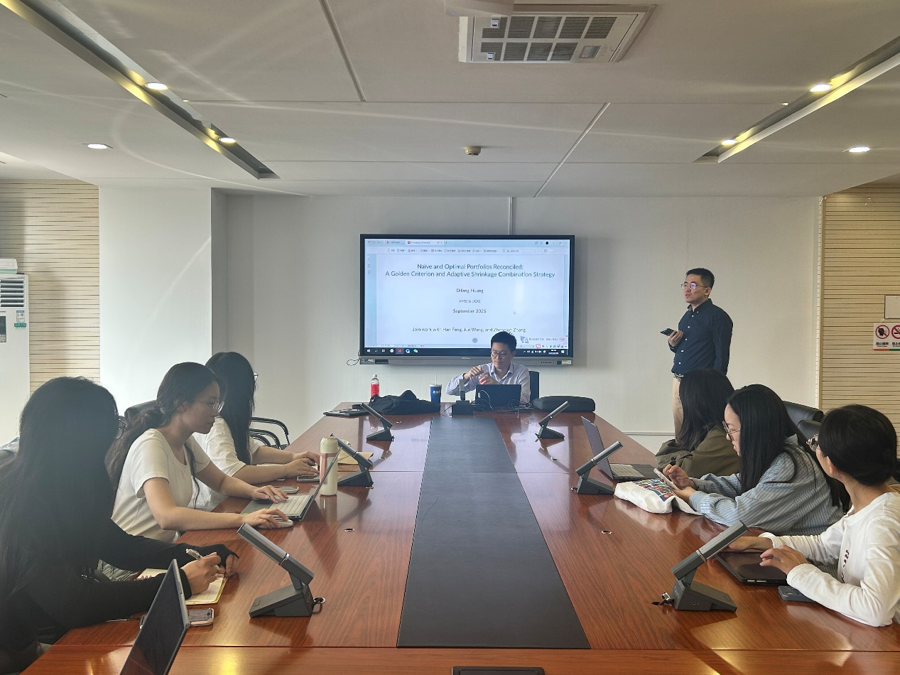 2025年9月26日上午,探花porn 举办SBF论坛2025年第8讲,特邀中国科探花porn 数学与系统科学研究院助理研究员黄棣芳带来题为《Naive and Optimal Portfolios Reconciled: A Golden Criterion and Adaptive Shrinkage Combination Strategy》的分享。本次学术讲座于博学楼506会议室举行,由探花porn 武伯尧老师主持。
