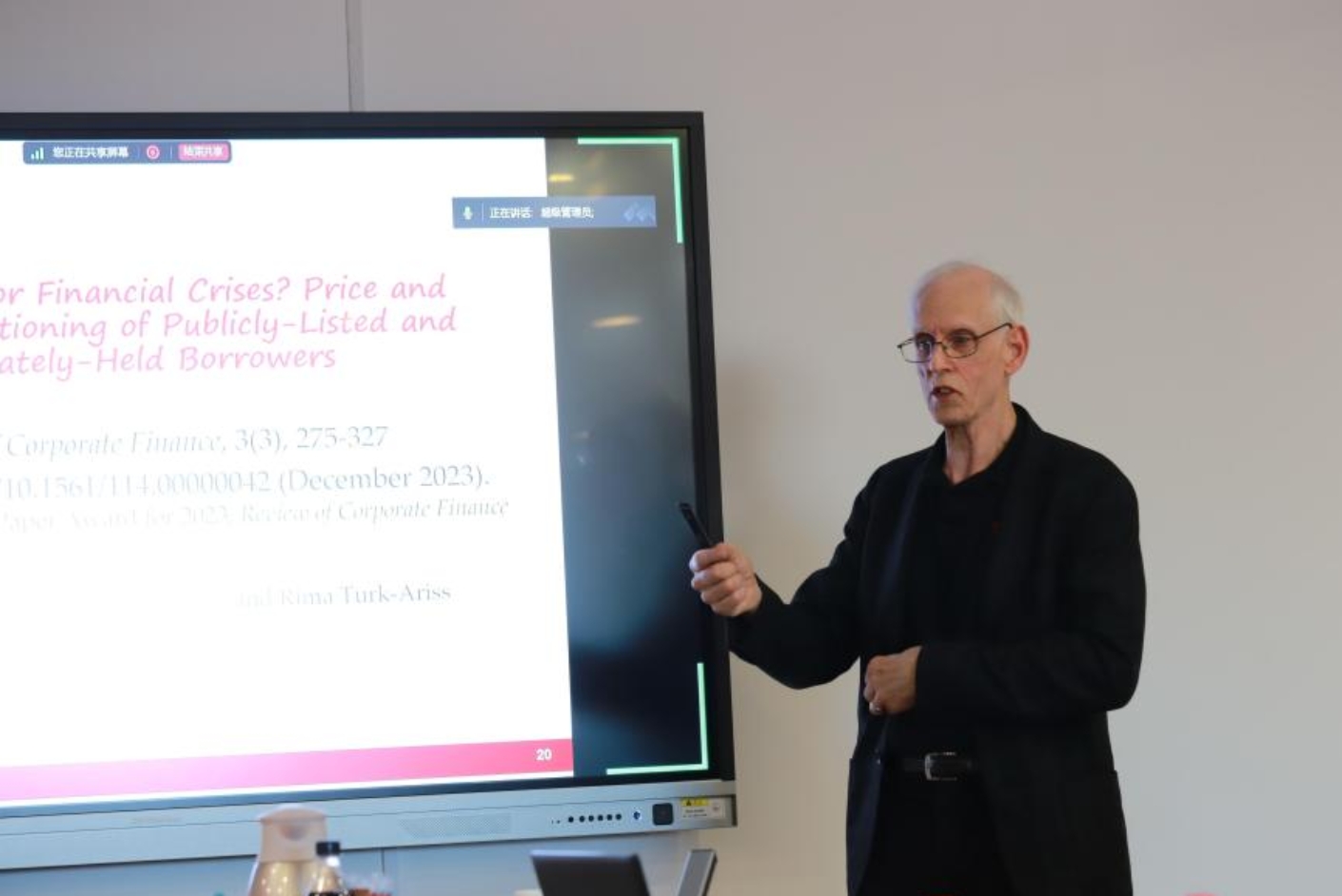 Allen Berger教授进行了题为“全球银行”的主旨演讲。他首先列举了经济全球化发展下国际市场上可能存在的各种风险与问题,并聚焦全球银行供应链金融相关研究、政策和数据进行分析。供应链全球化一方面可以给参与国家带来成本降低、市场扩展、资源优化和创新发展等优势,另一方面其对政治、经济、自然灾害等外部因素更加敏感,供应中断可能加剧风险在国际间传染。同时,管理全球供应链涉及各国不同的法律、文化和操作规范,增加了管理的复杂性。全球化银行体系可以通过提供多样的金融产品及服务、远程客户服务技术等帮助缓解上述问题,促进经济全球化可持续发展,同时能够更好地适应不同地区的监管要求,提高合规效率。最后,Allen Berger教授通过分布图向我们展示了系统重要性银行的全球布局。主旨演讲结束后,两位参会同学分别就“中小银行兼并重组的中美差异”和“大小银行的界定”等问题与Allen Berger教授展开讨论。