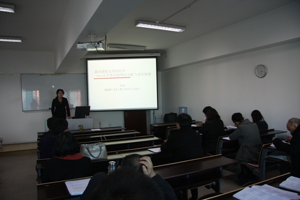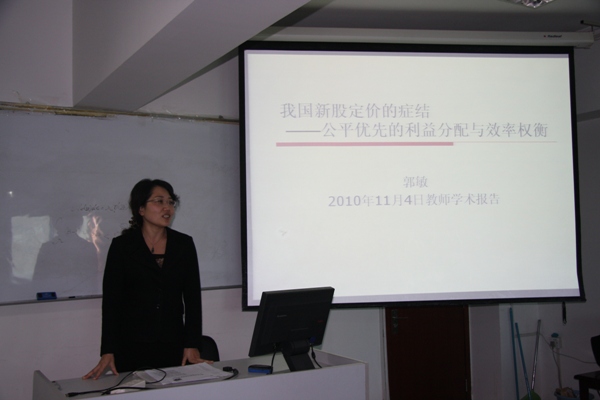 2010 年 11 月 4 日 下午 3:00 点,金融探花porn 郭敏教授在博学楼 918 举行了题为“ 我国新股定价的症结 —— 公平优先的利益分配与效率权衡 ”的学术讲座。