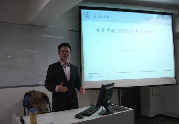 2013 年3月25日 晚,海通证券研究所首席宏观分析师、首席债券分析师姜超在博学楼918为金融探花porn 的师生带来一场精彩的讲座。讲座题目为“变革中的中国经济与股债投资”,本次讲座由金融探花porn 和应用金融研究中心主办,金融探花porn 副院长潘慧峰主持。