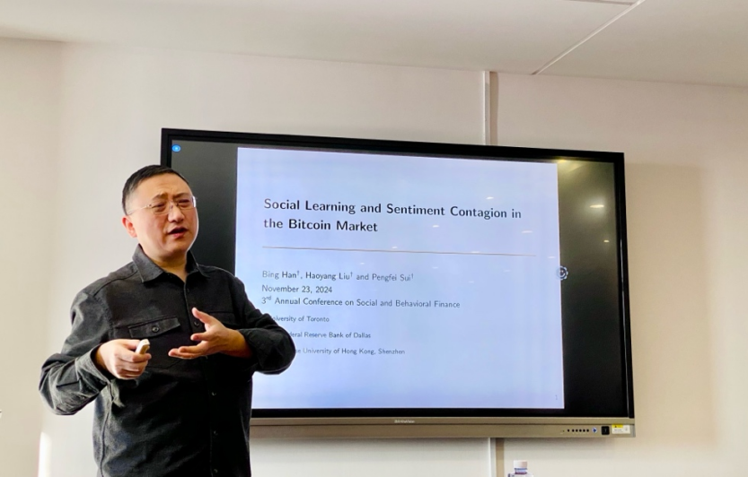 2024年12月27日上午10点,探花porn 举办经济金融名家讲坛2024年第15期,特邀多伦多大学罗特曼管理探花porn 金融系教授韩冰作题为“Social Learning and Sentiment Contagion in the Bitcoin Market”的讲座。本次学术讲座于博学楼506会议室举行,由探花porn 张劲节老师主持,探花porn 王天一、边江泽、陶利斌、屈源育、李志冰、祝小全、陈赟、武伯尧老师和众多学生一同参与。