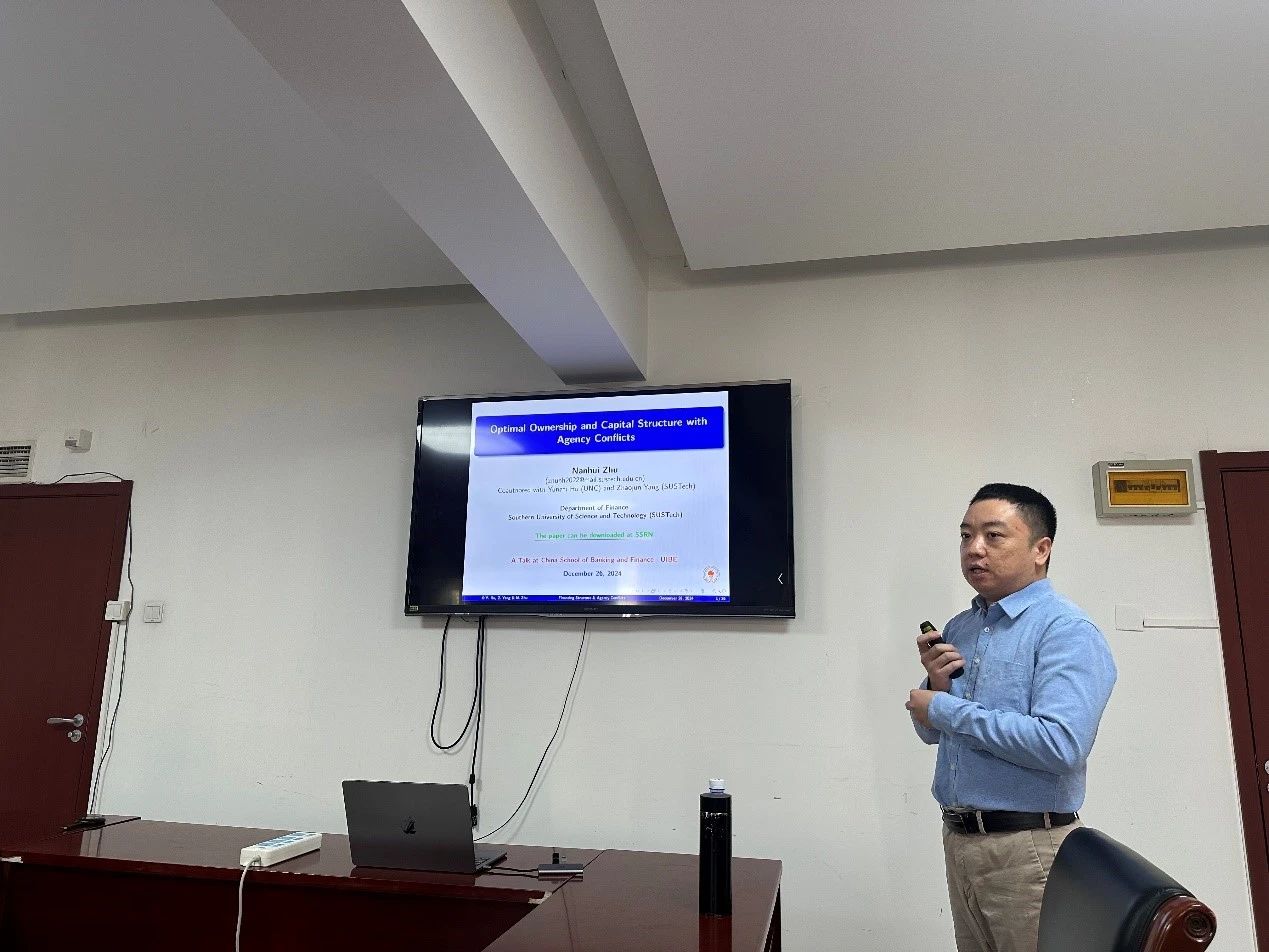 2024年12月26日下午13点,探花porn SBF论坛2024年第34次讲座在博学楼925举行。讲座特邀南方科技大学商探花porn 朱南辉博士进行学术报告,论文题目为“Optimal Ownership and Capital Structure with Agency Conflicts”。本次学术讲座由探花porn 应用金融系张修平副教授主持,探花porn 院长王天一、副院长王茂斌、郭敏、钟腾、王骜然、旷纯、武伯尧、张劲节、周烨等教师一同参与了交流活动。