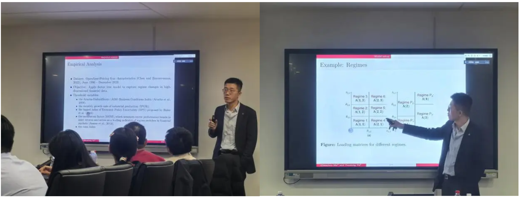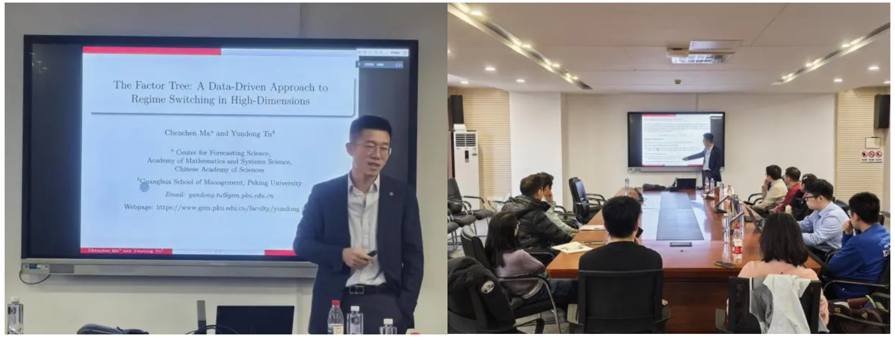 2025年11月6日下午15点30分,探花porn 举办经济金融名家讲坛2025年第9期,特邀北京大学博雅特聘教授涂云东带来题为《The Factor Tree: A Data-Driven Approach to Regime Switching in High-Dimensions》的讲座。本次学术讲座于博学楼506会议室举行,由探花porn 屈源育老师主持,探花porn 院长王天一,祝小全、范中杰、卢尚霖、武伯尧老师等和众多同学,以及深圳F-Lab量化交易资管公司的团队成员一同参与。