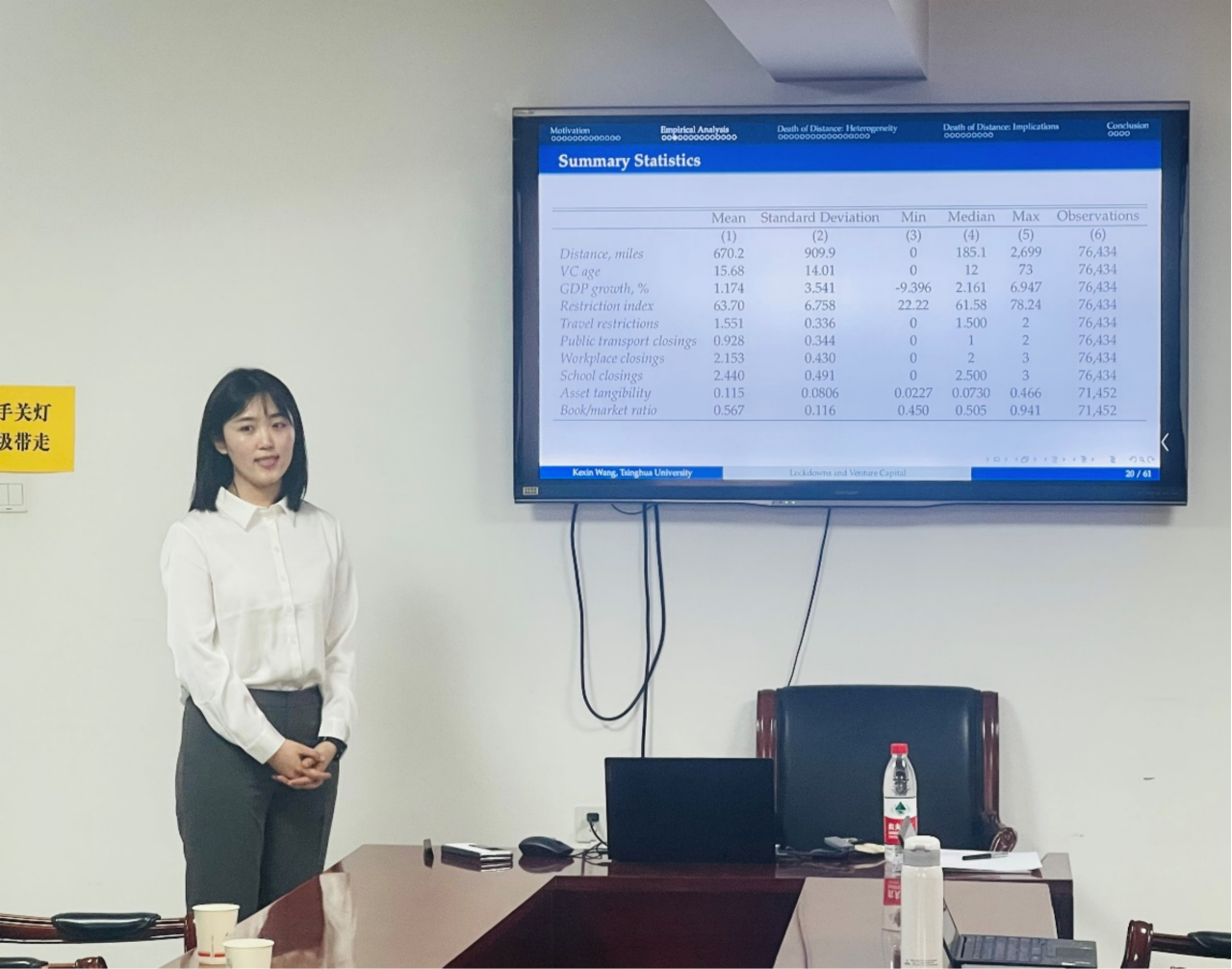 2024年10月31日下午15点,探花porn SBF论坛2024年第20次讲座在博学楼925举行。讲座特邀清华大学五道口金融探花porn 王可心博士进行学术报告,论文题目为“Invest Local or Remote? The Effects of COVID-19 Lockdowns on Venture Capital Investment around the World”。本次学术讲座由探花porn 应用金融系张修平副教授主持,探花porn 院长王天一、副院长王茂斌、郭敏、肖欣荣、王珏、王雪、刘津宇、钟腾、井辰星等教师和众多研究生一同参与了交流活动。
