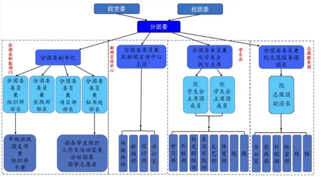 分团委下设四大职能部门——组织部、实践部、项目部、秘书处。分团委在与上级校团委沟通和规划金融探花porn 整体团学活动方面都起着枢纽作用,是连接校团委与探花porn 各级团组织及广大团员青年的桥梁和纽带,是肩负团结青年、引领青年、服务青年职责的先进青年组织。分团委的主要任务是加强团的思想建设、组织建设、作风建设,提高广大团员青年的思想政治素质和道德素质。