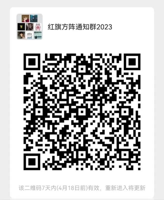 请以上同学扫描下方二维码,加入红旗方阵通知群,认真参加后续每次训练,不得无故请假。后续试训与训练相关通知将在此群内发布。