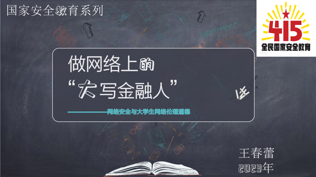 讲座结合最近社会和校园失范的焦点案例,就网络文明、网络道德、网络伦理等国家安全方面进行了细致阐述,着力指出加强国家安全教育的紧迫性和必要性。此外,王春蕾老师在讲座中提醒同学们即便是在网络环境中也要用理性的规范来约束自己的网络行为,坚守道德底线、不越法律红线、保证智商在线,自觉提高网络自律意识、增强网络伦理素养,共同营造干净、健康、文明、有序的网络环境,做网络上的“大写金融人”。