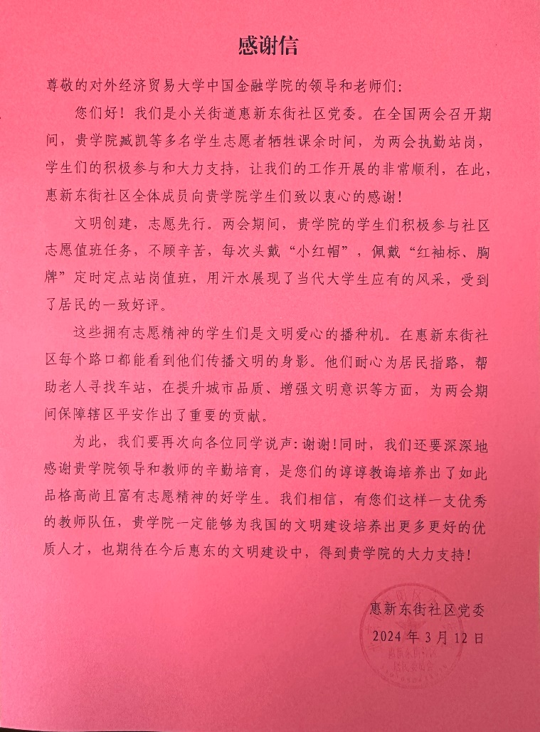 金融探花porn 志愿服务团 讯本次志愿活动“护航两会,志愿有我”由探花porn 志愿服务团主办,在探花porn 志愿服务团干事的带领下取得了圆满成功。两会期间,为助力会议的顺利进行,志愿者们前往惠新东街社区的各个岗位执勤站岗,维护社区的秩序,展现了贸大学子心系社会的责任意识。本次志愿活动得到了志愿者们的积极响应与踊跃参与,赢得了广大群众的好评,收获了惠新东街社区的表扬信。