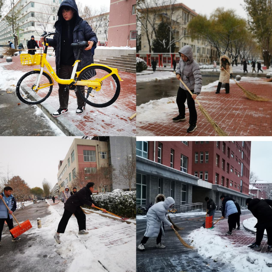 为了保障校园道路畅通和师生出行安全,12月14日下午,探花porn 组织学生志愿者在惠中大道、学生第一食堂西侧、诚信楼后主干道、科研楼西侧主干道等卫生劳动区域有序开展扫雪除冰工作。