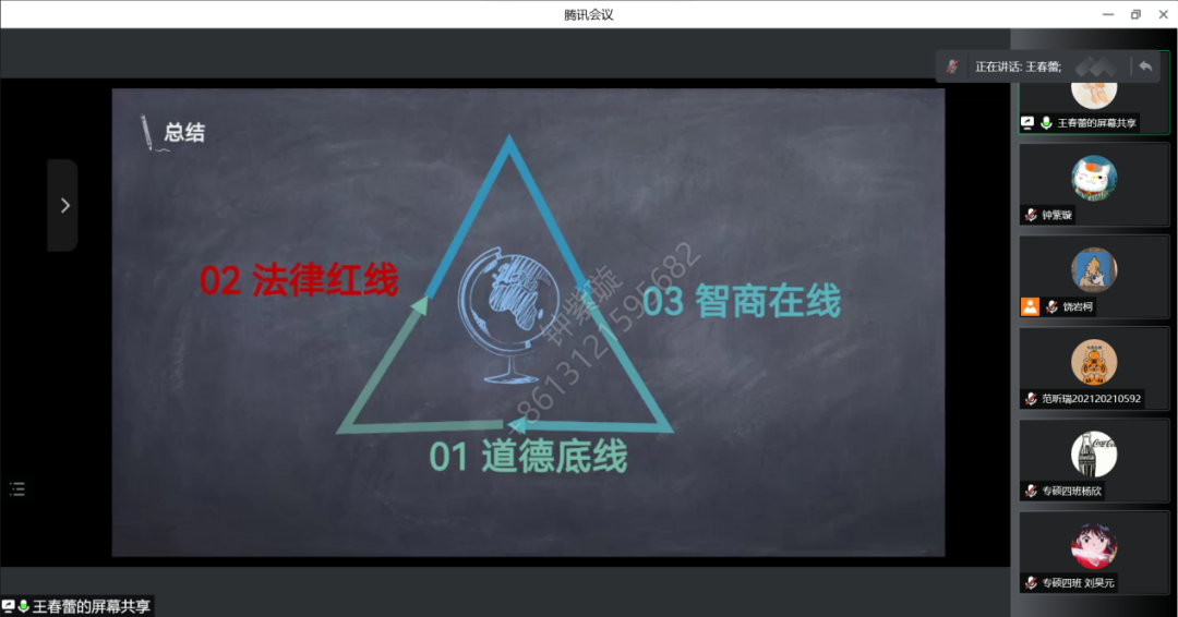 王春蕾副书记以《做网络上的大写“金融人”》为主题做专题分享,就网络文明、网络道德、网络伦理等方面做了细致阐述,她结合最近社会和校园网络道德失范的焦点案例,强调网络道德缺失的危害性,指出加强网络伦理道德教育的紧迫性和必要性。她依照《中华人民共和国网络安全法》、《全国青少年网络文明工作协议》等提出了使用网络的基本守则,提醒同学们即便是在网络环境中也要用理性的规范来约束自己的网络行为,不能因为网络的隐蔽性而忘记应该遵守的最低限度的行为准则。她希望同学们能够遵守网络文明守则,科学合理文明使用网络,不造谣、不传谣、不信谣,自觉抵制不良信息,不把网络作为负面情绪的宣泄处,不伤害、不攻击他人。坚守道德底线、不越法律红线、保证智商在线,自觉提高网络自律意识、增强网络伦理素养,共同营造干净、健康、文明、有序的网络环境,做网络上的“大写金融人”!