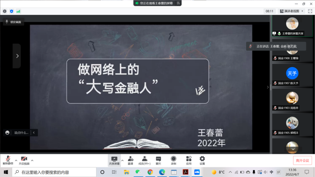 2022年4月7日下午,金融探花porn 在2019级本科年级大会和2021级研究生年级大会举行两场次的网络安全与网络文明教育讲座,会议以线上的腾讯会议形式召开,金融探花porn 党委副书记王春蕾老师做专题讲座。