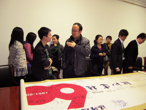 精心准备的精美纪念品,并请他们在校庆60周年校友签名卷轴上签名留念。活动在轻松融洽的氛围中结束。
