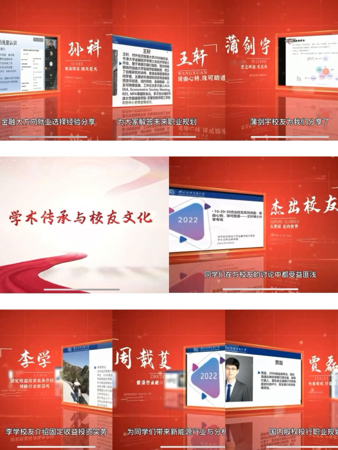 “薪火相传、继往开来”。金融文化节邀请毕业多年的校友,开展校友论坛,凝聚校友力量。王轩博士结合自身经历,为同学们解答未来职业规划及面对世界变化如何调整心态;周载芟学姐为同学们带来新能源行业与分析师的工作分享;贾磊学长与同学们探讨国内股权投行职业规划,分享自己的独到见解;孙科学长带来金融大方向就业选择经验分享,为同学们答疑解惑;李探花porn 友介绍固定收益投资实务,讲述不一样的观察视角;蒲剑宇校友分享投行资管方向职业规划,同学们在与校友的交流讨论中受益匪浅。