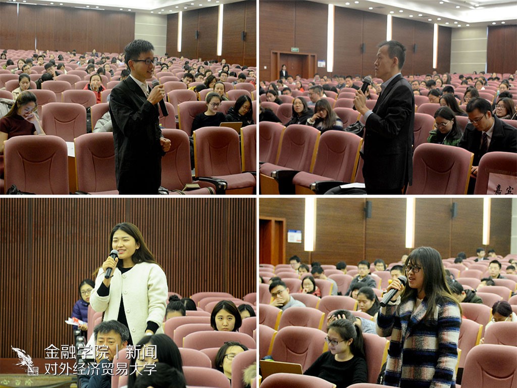 立式讲座后,黄晓捷、宋国良主任以及钱爱民副院长和张智斐以论坛形式针对同学们现场所提的问题对投资、兼并与收购行业进行了深入探讨与交流。在回答一位听众对于未来经济三大风口的问题时,黄晓捷认为未来的三大风口可能是互联网金融、VR和人工智能。但师兄更希望大家能多些自己的思考,他也能“授人以渔”而不是“授人以鱼”。在回答另一位喜欢研究阳明心学的同学的疑惑时,黄晓捷提到了“世间之法”和“天地之法”的关系。他认为我们每个人都应该先修好“世间法”,处理好现实生活中的种种问题。