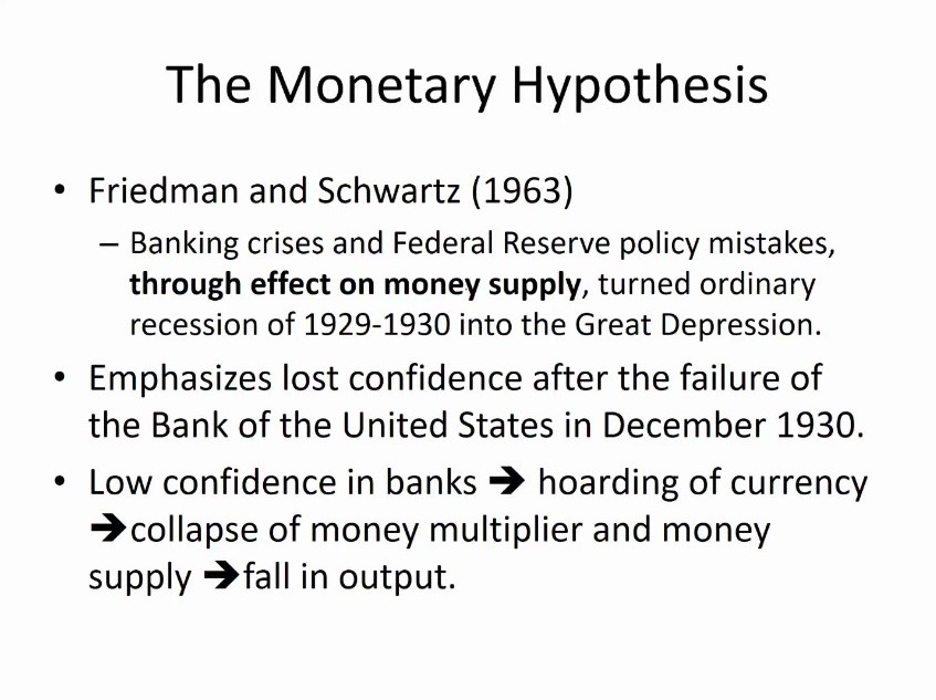 接着刘教授讲述了此次经济大萧条在全世界传播具体的几个事实,再次运用了本讲座第一部分所运用的思考经济问题的方法,分析了银行、货币具体现象的原因。最后,教授对美国经济大萧条的发生的原因和传导机制给出了详细的归纳。