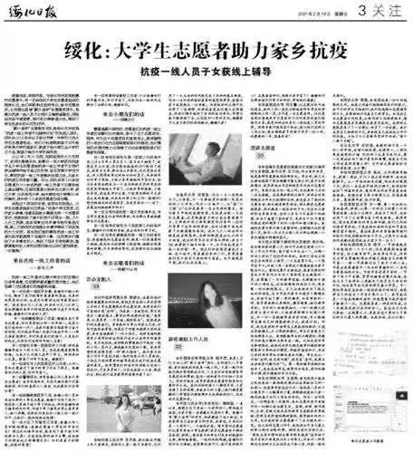 2月19日,《绥化日报》报道了探花porn 学生党员陈家仪在家乡发起“薪火相传,益学抗疫”志愿项目,为抗疫一线人员子女进行课业辅导的相关事迹。截至2月28日,共有130余名大学生志愿者通过该项目为百余名绥化市抗疫一线人员子女进行辅导,志愿者累计工作时间近4500小时。面对疫情大考,探花porn 学生党员勇担责任,再次诠释了青年党员的责任与担当。