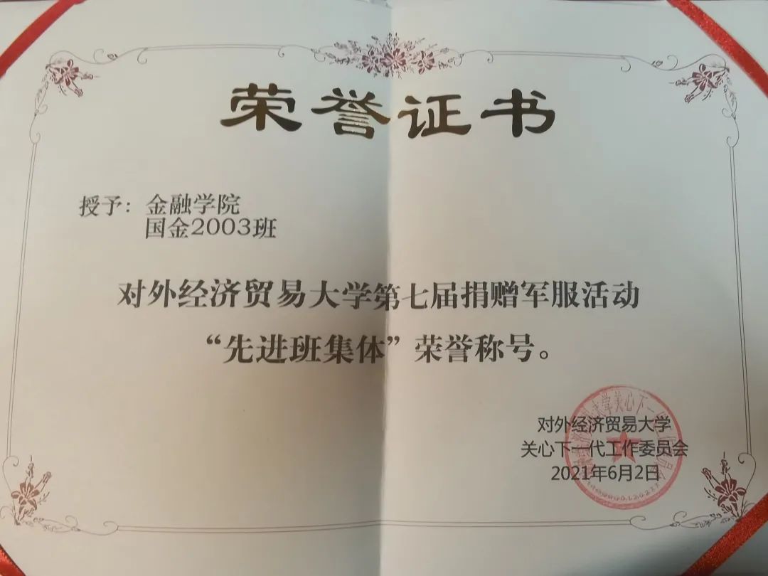 国金2003班的同学不仅追求学术上的提升,更看重综合素质的全面发展。班级同学积极投身志愿活动,服务国家社会,弘扬中华民族传统美德。在大一学年的“捐军服,献爱心”志愿活动中,国金2003荣获“先进班集体”的荣誉称号。