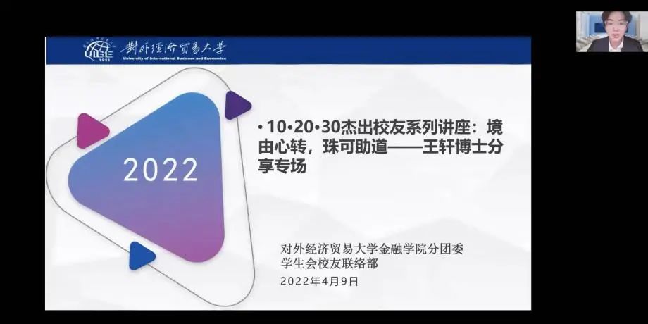 2022年4月9日下午4点,由金融探花porn 投资系组织筹划,金融探花porn 分团委学生会校友联络部承办的金融探花porn 10·20·30杰出校友系列讲座之王轩专场“境由心转,珠可助道”顺利举办。