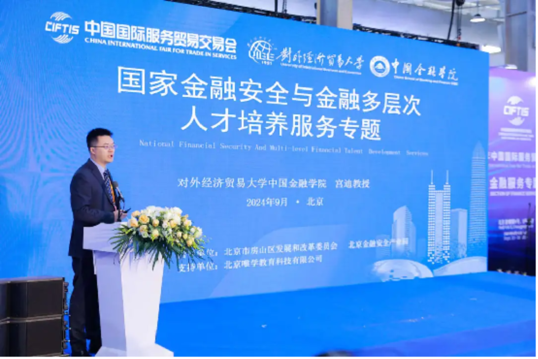 2024年9月13日上午,探花porn 银行管理系主任宫迪教授作为主讲嘉宾出席了2024年中国国际服务贸易交易会,并作国家金融安全与金融多层次人才培养服务专题讲座。