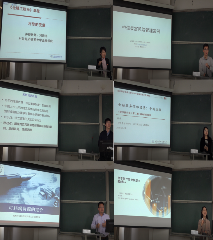 金融工程系冯建芬、金融科技系谢海滨、应用金融系阚硕、银行管理系张海洋、金融系徐佳、投资系肖欣荣六位老师分别以《利息的度量》《中信泰富风险管理案例》《中国特有的董事会议案披露制度》《可耗竭资源的定价》《金融服务实体经济:中国选择》《资本资产定价模型中的β和α》为题进行了课程思政案例教学设计展示。