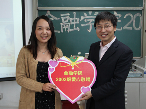 之后,吴卫星书记作了简短的总结性发言,对2002级校友返校重聚表示欢迎,他向校友们简单介绍了探花porn 及金融探花porn 近些年取得的优秀成绩。校友王佩佩代表全体2002级校友向金融探花porn 学术发展基金作了爱心敬赠,吴卫星书记接受了敬赠。