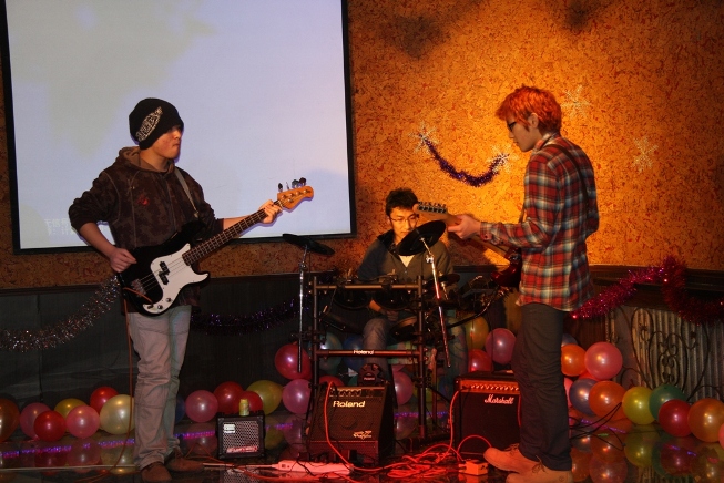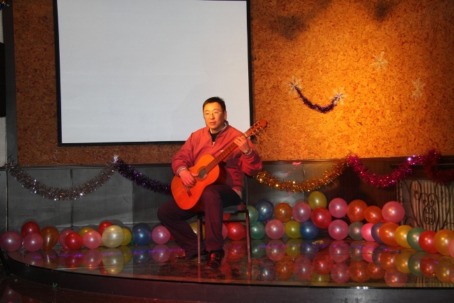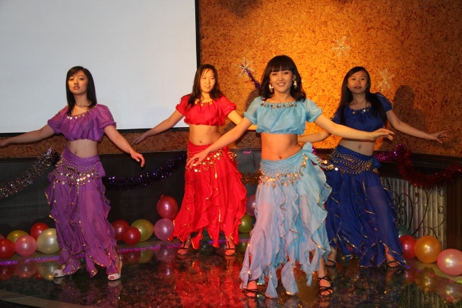 用歌声与欢笑喜迎新年,头戴道具,敛裾徐行,4位2009级同学给大家带来了独具风情的肚皮舞;一段小品“灰姑娘的故事”,仿佛带领观众回到了美丽的童真时代; 李永龄老师的吉他独奏更是博得了现场的阵阵掌声; 2010级叶语灵同学的歌声征服了在场的每一位观众,把整个晚会推向了高潮。
