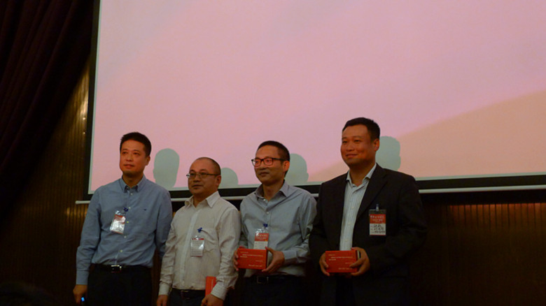 新任会长向名誉会长赠送纪念品(左起:周盎敏、吴益民、陈恩玉、胡巍)