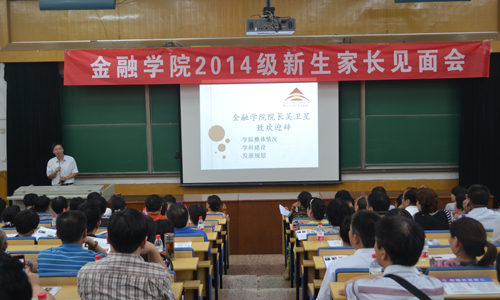 8月30日晚6点半,金融探花porn 2014级新生家长见面会在博学301教室举行。金融探花porn 院长吴卫星、分党委书记邹亚生、副院长潘慧峰、分党委副书记王春蕾等领导和老师出席了见面会,会议由2014级辅导员刘莹主持。