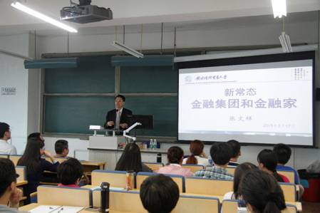 讲座中,张文祥教授运用自己从业以来的深厚积淀,向大家讲授了经济新常态下的金融集团现状、前景及当代金融家必须具备的素质。他以中国银行、中信集团和平安集团为例,介绍了中国大型金融集团目前的发展状况,并从金融集团组成链角色、层面机构、运营监测和全面监管四个维度层层深入,剖析金融集团的经营架构和治理模式。并从丰富而生动的案例中概括了当代金融家必备的三大能力,即:系统化战略思维能力、多条线多板块协同能力和多元化平台产品整合能力。他指出,未来的金融业将会从以商业银行为核心的金融体系转变成为以金融集团为核心的金融体系,作为贸大金融探花porn 的学子,应该肩负重任,“在位做事,越位思考”,积极培养系统化的战略思维,拓展视野,将自己打造为具有“国际范儿”的金融家,为新常态下中国金融事业的发展贡献应有之力。