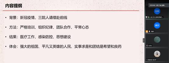此次主题党日活动,特别邀请国家援鄂抗疫医疗队刘烨医生与师生在线交流其亲身经历的2020年这场抗击新型冠状病毒感染肺炎疫情战斗中发生的那些惊心动魄、可歌可泣的动人故事。