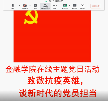 2020年6月19日20:00,金融探花porn 全体教职工和学生党员、入党积极分子300余人共同参加了探花porn 党委举办的“致敬抗疫英雄,谈新时代党员担当”在线主题党日活动。活动由金融工程专业教师党支部书记冯建芬主持。