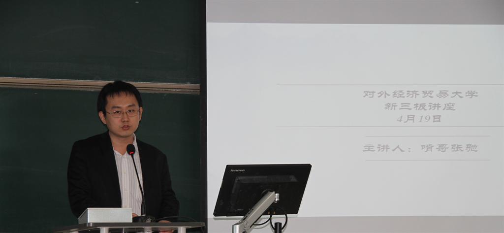 吴卫星院长主持讲座,他对张弛校友的到来表示热烈欢迎,并介绍了张弛校友的工作经历。张弛校友回顾了他在贸大求学期间的校园生活,对母校的培养表示感谢,并简单介绍了其毕业后从会计师事务所转至投资管理行业,随后进入实业公司积累经验且最终回归投资管理行业的职场经历。在用一系列数据展示了目前新三板市场的热度后,张弛校友将讲座引入正题,分市场简介和投资机会两个方面为大家深入浅出地讲解了新三板市场的具体情况,依次介绍了新三板的市场定位、发展历程、交易方式、挂牌企业的行业分布以及政策呵护、流动性改善给新三板市场投资者带来的盈利机会。