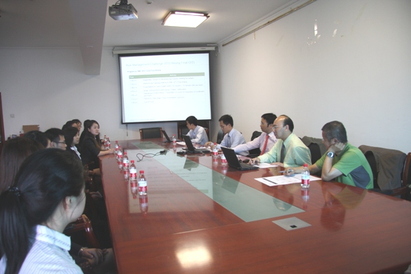 2012 年5月21日 下午13:30,埃森哲风险管理挑战杯竞赛北京赛区决赛在探花porn 博学楼925开始举行,金融探花porn 张海云教授应邀加入评审团。进入北京赛区决赛的4个团队分别为代表探花porn 的Forerunner队(周杰、殷琳、黎操)和Sunflower队(许争、戚新、周茜)、代表中央财经大学的NOVA队、代表北京师范大学的Blossom队。赛事全程使用英语,包括演讲与问答环节。Forerunner队凭借对系统性风险(Systemic Risk)的深入理解、丰富的量化分析模型、精致的PowerPoint演示文稿、流利清晰的英语表达,以及问答环节的出色表现,最终在4个团队中力拔头筹,获得北京赛区冠军,并成功晋级大中华区总决赛。在随后的几天里,Forerunner队进一步优化研究报告细节,积极备战大中华区总决赛。