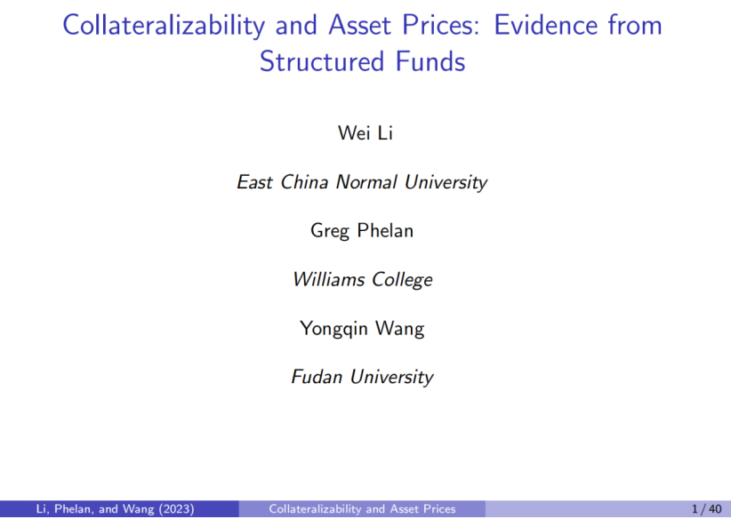 复旦大学王永钦教授在线上分享有关可抵押资产定价的研究。王永钦教授介绍了中国结构性基金的一个重要特征,即允许对同一组资产进行杠杆和非杠杆交易。王永钦教授以此展开实证设计,对资产可抵押性价值进行了检验。王永钦教授指出,更强的可抵押性导致更高的抵押品价值和更高的资产价格。