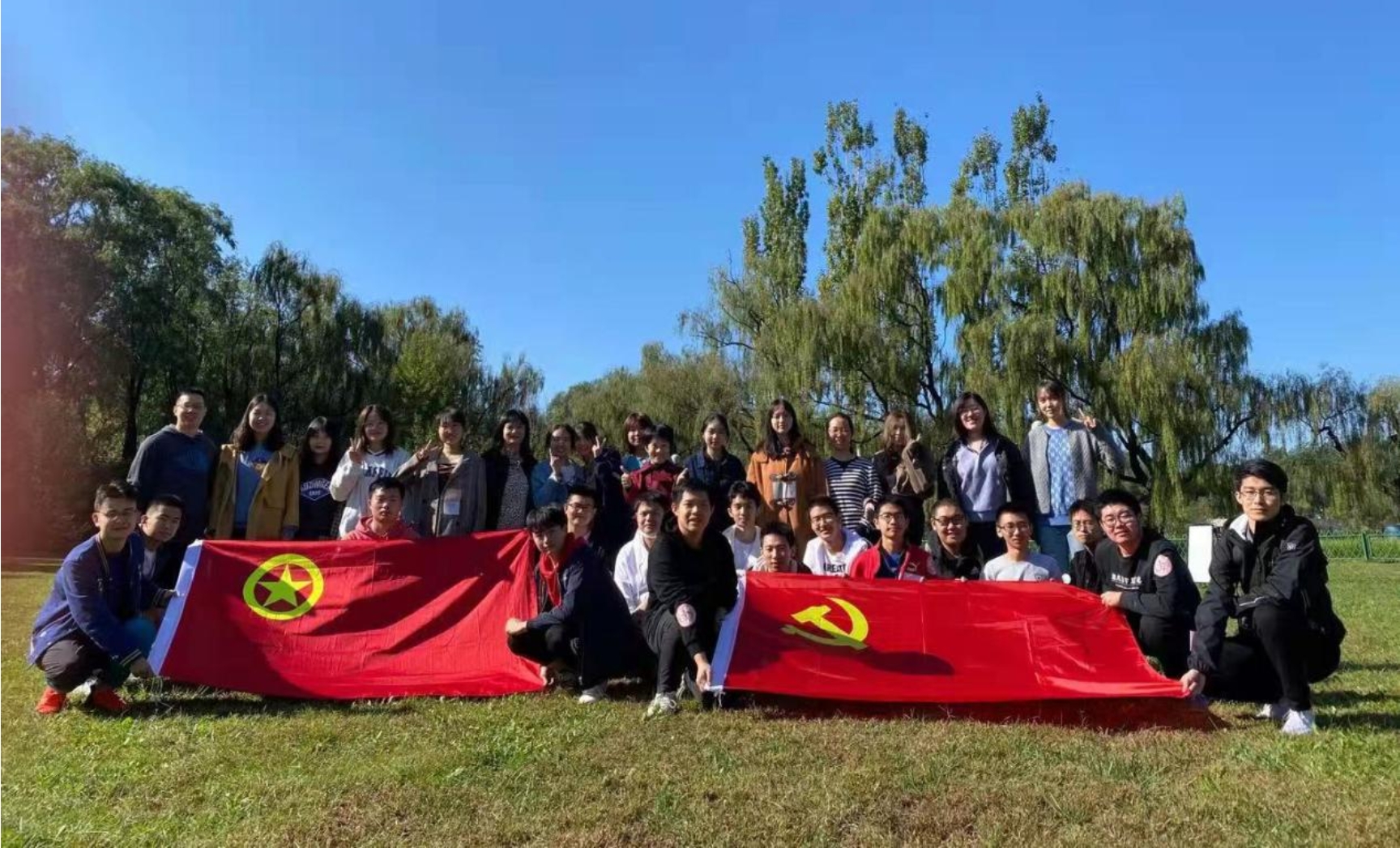上午9:00,大家在宁远楼前坪集合完毕,乘坐大巴前往奥森公园,随后步行前往预定地点。迎着朝阳,同学们怀着满溢的期待和热情,一路欢声笑语,步伐轻盈。走在前面的两位同学高举党旗和团旗,两面红旗迎风高高飘扬,激荡出同学们爱党爱团的情感,也引得不少行人驻足注目。
