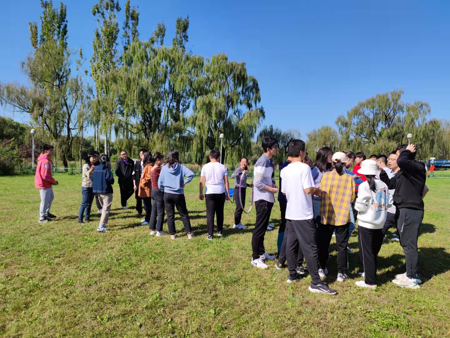 天朗气清,惠风和畅。2021年10月7日,2019-2021三届量化金融实验班学生集结在一起,在奥林匹克森林公园顺利进行了秋日户外拓展团建活动。本次活动发展了金量各年级间团结相助关系,促进了师生之间的良性互动,同时展现了金院学子的青春活力。本次活动由王天一、邓军、余湄、冯建芬四位老师带领,共有三十二位留京在校同学参加,王雨晴和傅钰两位同学担任活动主持。