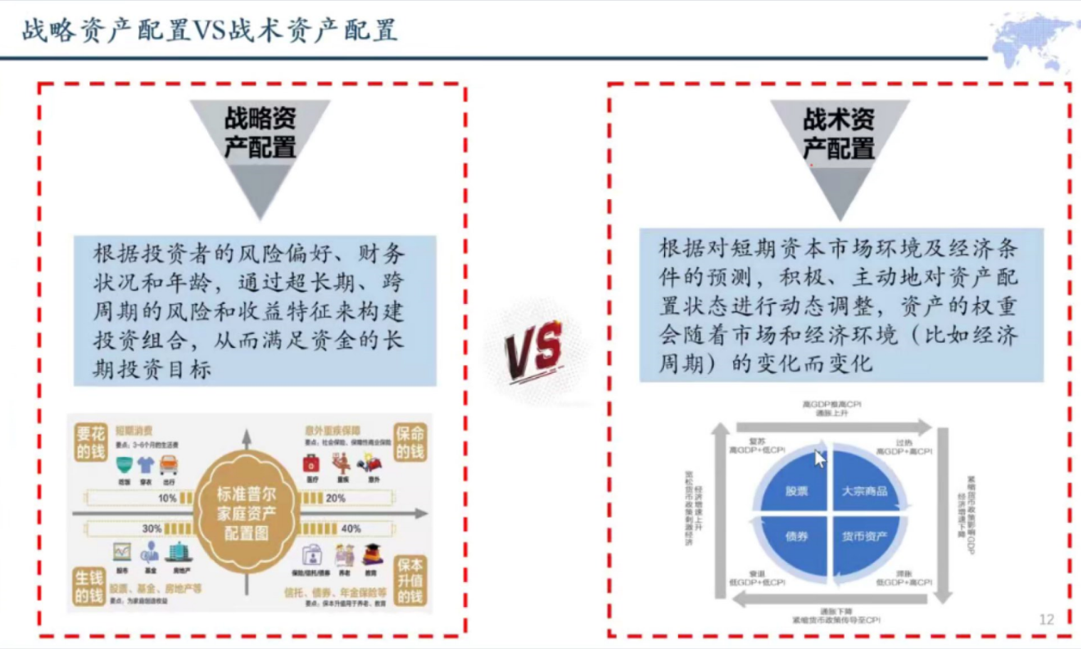 在对基本面信息进行了详细介绍后,袁军博士对战略资产配置和战术资产配置进行了对比分析。战略资产配置主要是根据投资者的风险偏好、财务状况和年龄等,通过超长期、跨周期的风险和收益特征来构建投资组合,从而满足资金的长期投资目标。而战术资产配置是指,根据对短期资本市场环境及经济条件的预测,积极、主动地对资产配置状态进行动态调整,资产的权重会伴随着市场和经济环境(比如经济周期)的变化而变化。
