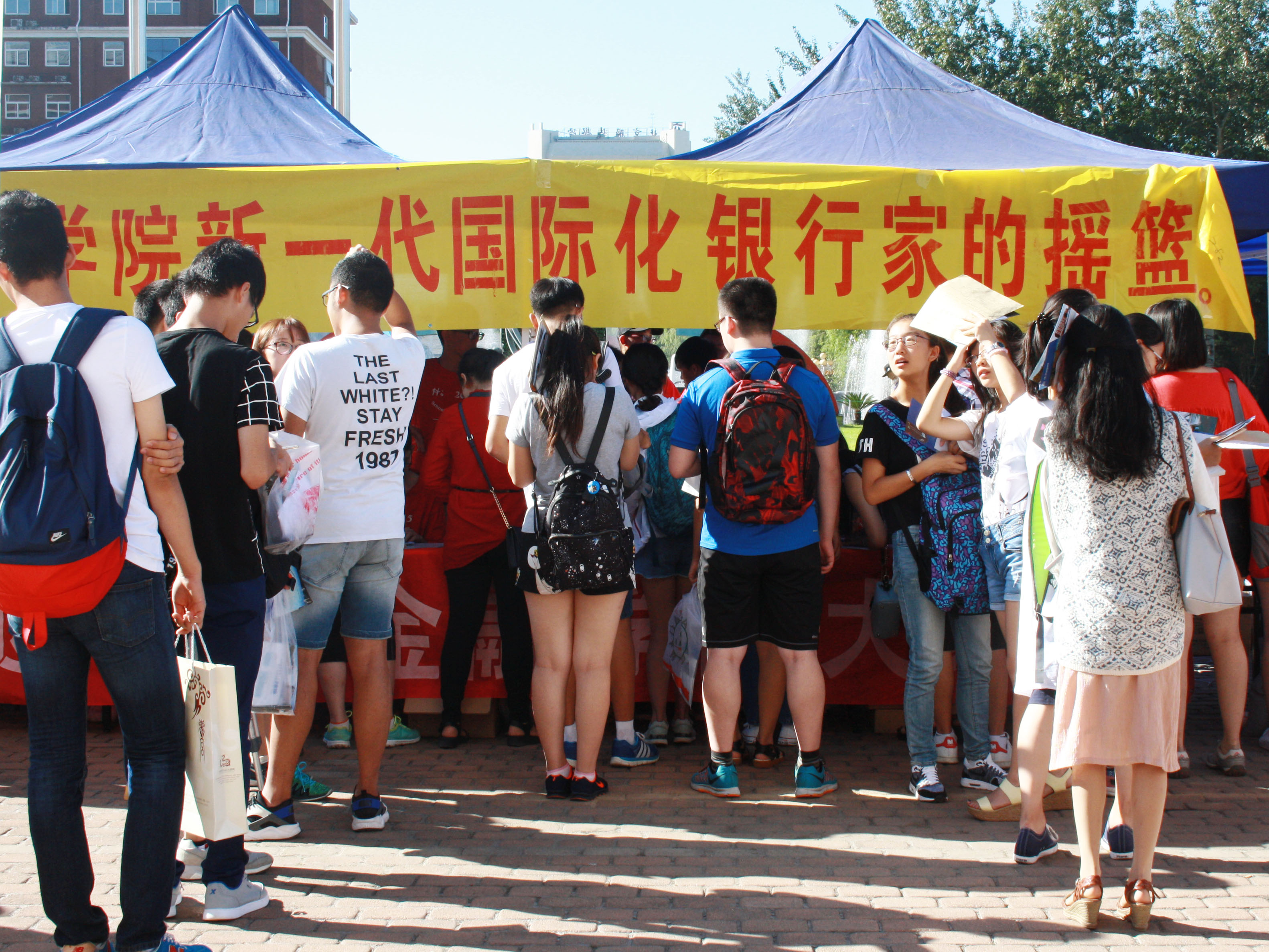 “新一代国际化银行家的摇篮”横幅下,一张张新鲜的面孔在志愿者的引导下提交高中档案,领取迎新材料和院衫,向他们的高中时代告别,迎来崭新的四年。以向日葵为背景的签名墙上逐渐签满了三百多名新生的名字。签名墙前,学生们露出灿烂笑容,用相机记录下他们大学生活中的第一个重要时刻。