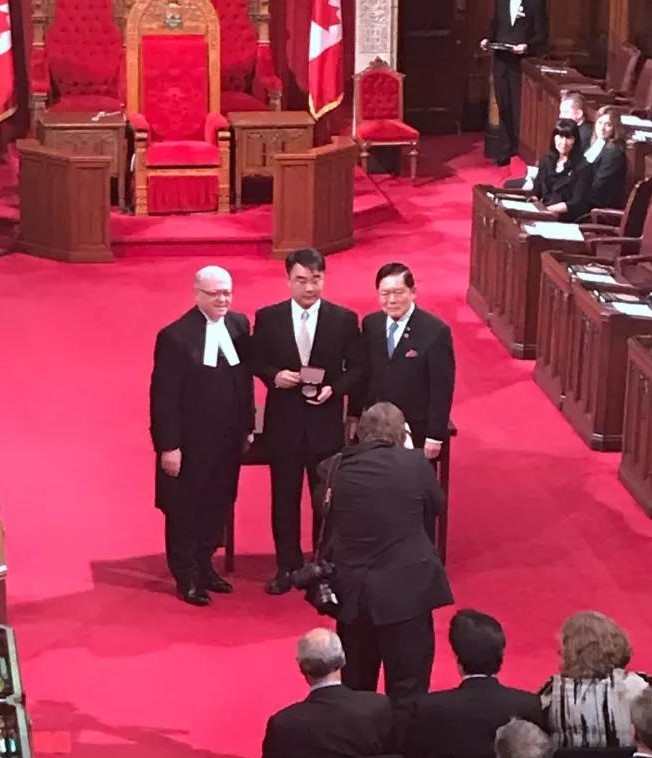 为庆祝加拿大建国150周年,加拿大联邦参议院于11月29日在渥太华国会山举行隆重庆典,联邦参议院参议长George J. Furey 亲自为获得加拿大建国150周年勋章的各界精英授勋。这是加拿大联邦参议院150年来首次举行集中授勋仪式,以表彰为加拿大社会及社区作出杰出贡献的精英人士。