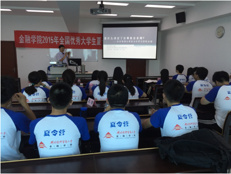 专题讲座环节,丁志杰校长助理向同学们介绍了十三五期间对外金融战略与政策调整,鼓励大家多注重经济金融与实际问题的结合,善于运用现代信息技术拓展自己的学习;张博辉博士则以自己的亲身经历与同学们分享其关于国际金融的一些看法,对大家所关注的近期中国股市动荡发表了自己的见解,与同学们分享了媒体金融这个新兴概念;郑红亮研究员从经济全球化的视角出发,对中国经济新常态进行了解读,并对一些中国经济的热点问题例如上海自贸区、京津冀一体化等与营员们进行了探讨;韩会师博士对商业银行业务以及货币政策工具进行了介绍,并就银行配资对股市所带来的影响发表了看法;张海云教授就资产证券化这个问题与营员们展开深入交流,并对同学们困惑的研究方向选择提出自己的意见和建议;吴卫星院长突破以往的教学模式,就其研究的公募基金这个课题与同学们进行深入探讨,以实际的案例引导同学们学习如何运用金融知识。营员们积极反馈,此次夏令营活动不同于以往探花porn 的学习课程,理论和实际联系非常紧密,老师们的经验分享和知识传授让营员们觉得受益匪浅,每次课程结束后,营员们仍积极对课程内容与老师进行深入探讨,踊跃地发表自己的想法见解。