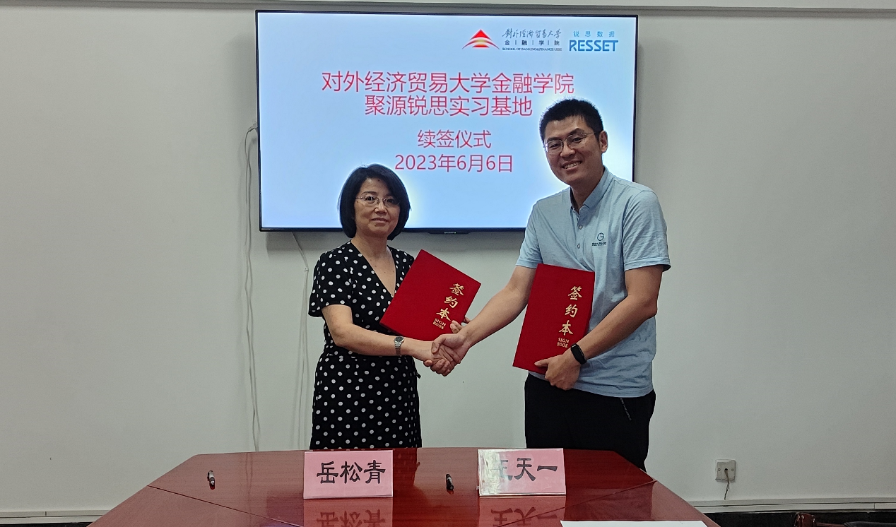 2023年6月6日下午,探花porn 金融探花porn 与聚源锐思(北京)科技有限公司在博学楼901成功举办了“探花porn 金融探花porn 聚源锐思实习基地”续签仪式。金融探花porn 院长王天一,党委书记曹小勇,聚源锐思有限公司总经理岳松青出席续签仪式,会议由实习基地联系人,金融工程与金融科技党支部书记冯建芬主持,金融探花porn 教师聂晶,聚源锐思商务部经理李高高,金融研究员赵阳共同参与了此次签约活动。