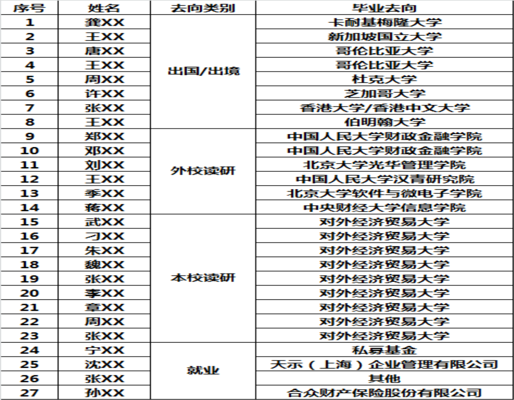 经过4年的努力,2020年首届毕业生取得了可喜的成绩。50%的学生拿到了海(境)外知名大学的硕士项目录取,但因为疫情影响,最终有29.63%的学生去往卡耐基梅隆、哥伦比亚大学、芝加哥大学等世界名校继续深造, 55.55%的学生去往北京大学、中国人民大学等国内知名高校读研,14.82%的学生直接就业。在艰难的2020年仍然创造了100%的就业率,同时继续深造比例达到85%以上,达到了实验班培养研究型拔尖创新人才的目的。