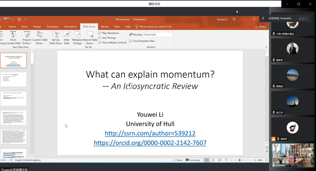 为帮助博士生开展科研和学术生涯规划,进一步拓宽博士生的学术视野,激发博士生的创新思维,2022年11月15日,金融探花porn 线上举行了首场博士生科研论坛,特邀赫尔大学的李有伟教授和首都经济贸易大学的何枫教授对博士生的论文写做和投稿进行指导。金融探花porn 主管副院长王天一教授及金院教师、博士生参加了会议。